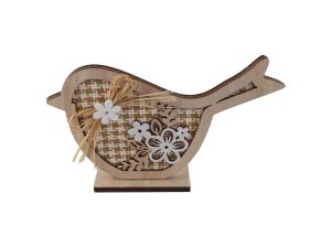 Dekorace dřevěná textil ptáček na postavení v přírodní a hnědé barvě 235x45x140mm