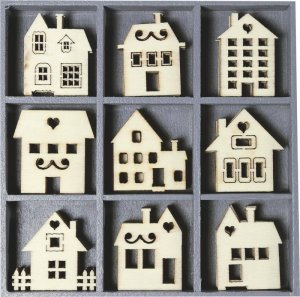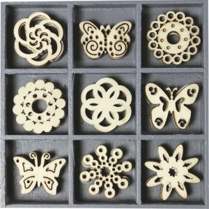 Dřevěné ozdoby v praktickém boxu, 9 motivů po 5 ks.