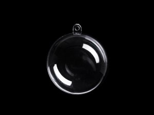 Průhledná plastová koule se skládá ze dvou částí, které lze spojit a pomocí očka zavěsit jako dekoraci.