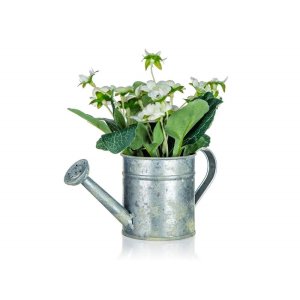 Bíla květina Begonia v plechovém květináči ve tvaru konvičky 17 x 15 cm, je umělá květina, která slouží jako náhrada živých rostlin a skvěle se hodí pro dekorování bytových prostor.