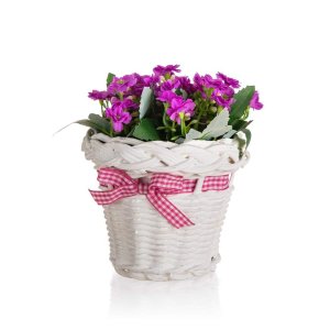 Květina v ratanovém košíku se stuhou 13 x 14 cm, fialová je umělá květina, která slouží jako náhrada živých rostlin a skvěle se hodí pro dekorování bytových prostor.