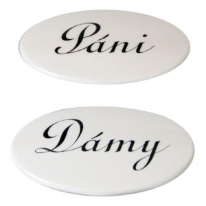 materiál: plast bílý Sada dveřních štítků s popisem DÁMY + PÁNI slouží k označení dveří bytového jádra.