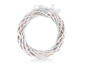 Věnec ratanový v bílé barvě o rozměru 26 x 26 cm.