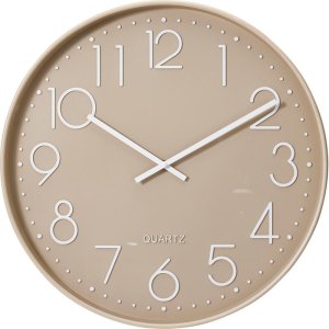 Nástěnné hodiny Napájení z baterie Rozměry 250 MM Pouzdro ve tvaru kruhu Plastové pouzdro Hnědá barva pouzdra Ručičkový ciferník Hnědá barva ciferníku Ciferník s arabskými čísly