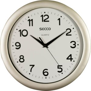 Nástěnné hodiny Napájení z baterie Rozměry 250 MM Pouzdro ve tvaru kruhu Plastové pouzdro Zlatavá barva pouzdra Ručičkový ciferník Zlatavá barva ciferníku Ciferník s arabskými čísly