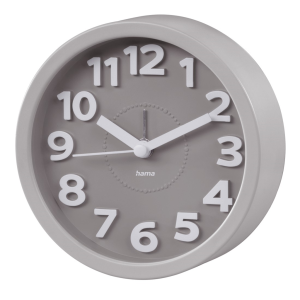 Budík Napájení z baterie Pouzdro ve tvaru obdelníku Plastové pouzdro Šedá barva pouzdra Ručičkový ciferník Bílá barva ciferníku Ciferník s arabskými čísly Budík