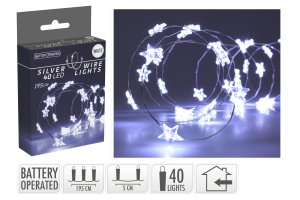 Osvětlení vánoční 1,95 m, 40LED, studená BÍ, drát, HVĚZDY. délka: 1,95 m studená bílá 40LED baterie 3 x AA, nejsou součástí Klasické vánoční osvětlení se studeným bílým světlem k vnitřnímu použití.