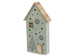 Svítící dekorační domeček má základ z pevného filcu a střechu a detaily ze dřeva.