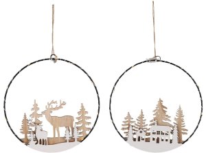 Závěsná LED dekorace o rozměru 240×20×260 mm v kombinaci kovu a dřeva s motivy jelena, stromků a domků.