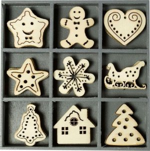 Dřevěné ozdoby v praktickém boxu, 9 motivů po 5 ks od každého motivu, celkem tedy 45 kusů dekorací.