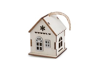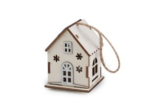 Dřevěný svítící domeček má poutavě zpracované výřezy.