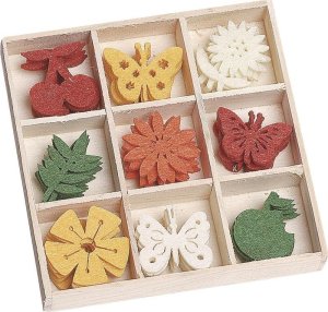 Filcové ozdoby v praktickém boxu, 9 motivů po 5 ks.