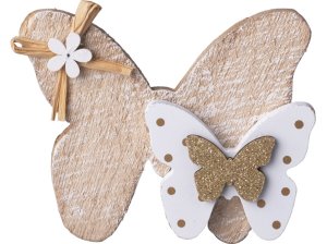 Dekorace dřevění motýli přírodní v bílé barvě s glitrem 120x100mm