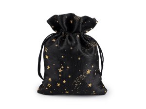 Vánoční dárkový pytlík ozdobený zlatým metalickým potiskem hvězdiček působí elegantně a luxusně.