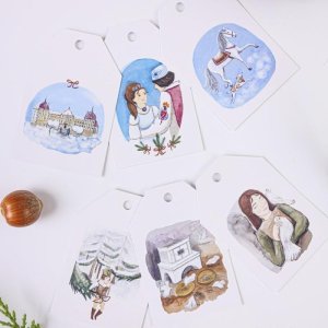 Dárková taška 260×320 mm – skřítci a vánoční krajina, barevný mix motivů.