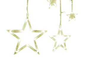 Osvětlení vánoční 4,5 m, 138LED, ZÁVĚS, HVĚZDY. celková délka: 4,5 m přívodní drát: 2 m 12 ks pásků: 60 cm / 120 cm průměr hvězdy: 10 cm / 20 cm 138LED vnitřní použití lze instalovat na záclonovou tyč …