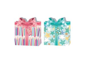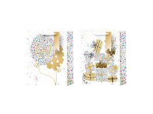 Dárková taška o rozměru 260×120×320 mm s motivem párty dárků a balónků.