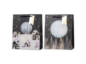 Dárková taška 260×320 mm – zimní krajina, mix motivů v černé, bílé a zlaté barvě.