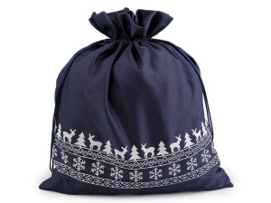 Vánoční dárkový pytlík je z obou stran ozdobený potiskem sobů, stromečků a vloček.