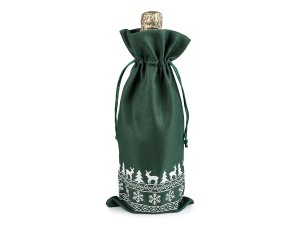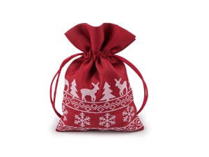 [Vánoční dárkový pytlík je z obou stran ozdobený potiskem sobů, stromečků a vloček.