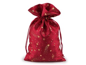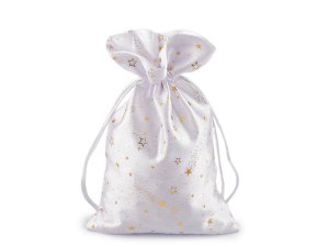 Vánoční dárkový pytlík je na obou stranách ozdobený potiskem zlatých metalických hvězdiček.