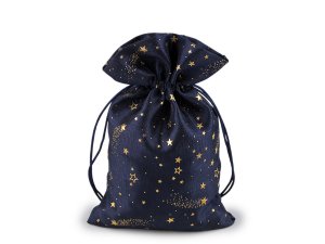 Vánoční dárkový pytlík je středně velký, z obou stran ozdobený potiskem zlatých metalických hvězdiček.