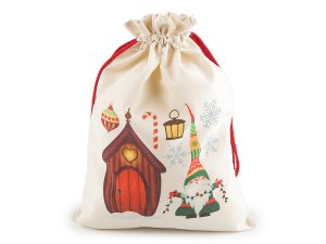 Pytlík s vánočními motivy se stahuje pomocí saténových šňůrek.