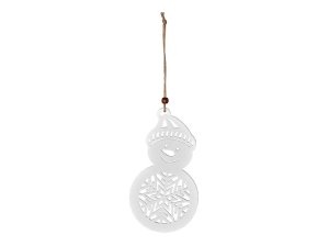 Závěsná dřevěná dekorace – sněhulák v hvězdě 110×130 mm, přírodní s glitrem a mixem barev.