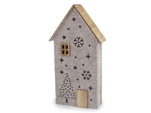 Svítící dekorační domeček má základ z pevného filcu a střechu a detaily ze dřeva.