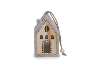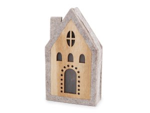 Svítící domeček je vyrobený z kombinace dřeva a pevného filcu.