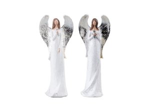 Soška anděla je jemně posypaná třpytivými glitry a má působivě propracované detaily.