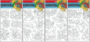Okenní fólie s barevnými motivy vloček a ozdob pro rychlou a snadnou vánoční výzdobu oken.