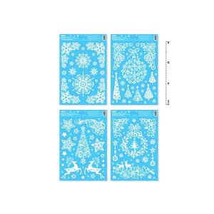 Vánoční okenní fólie bez lepidla s vánočními motivy (vločky, stromky, hvězdy).