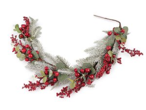 Girlanda z umělého jehličí. Konce větviček jsou bíle obarveny, pro získání efektu zasněžení Je dozdobena šiškami v přírodní barvě a červenými bobulkami.