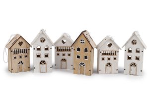 Malé dřevěné domečky můžete díky poutku zavěsit na stromeček, dekorační věnce, větvičky ve váze apod.