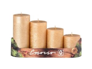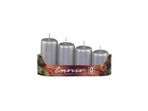 Sada adventních svíček. Mají tvar válce a povrch mají hladký, v úpravě metalický lesk.