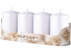 4 adventní svíčky matné bílé barvy ve tvaru válce setříděné dle výšky.