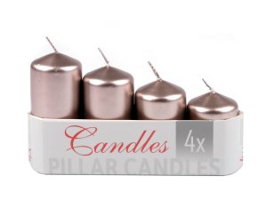Sada adventních svíček. Mají tvar válce a povrch mají hladký, v úpravě metalický lesk.