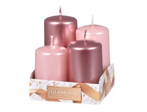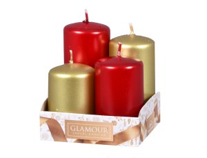 Sada adventních svíček. Mají tvar válce a tvoří kombinaci několika druhů dekorů: matný, metalický, lakovaný a brokátový.