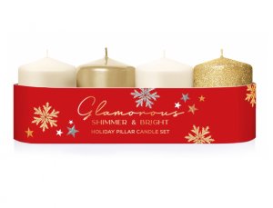 Sada stupňovitých svíček. Mají tvar válce a tvoří kombinaci několika druhů dekorů: matný, metalický, lakovaný a brokátový.
