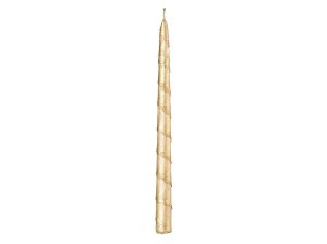 Matná zlatá vánoční kónická svíčka zdobená zlatými glitrovými proužky.