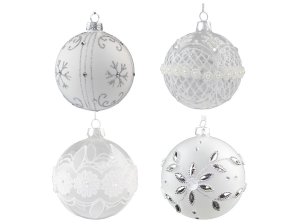 Bílá vánoční svíčka ve tvaru koule zdobená bílými glitrovými proužky.