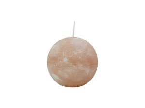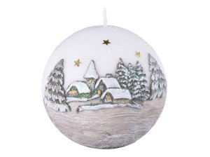Vánoční svíčka ve tvaru koule s plastickým reliéfem zdobená stříbrnými hvězdičkami.