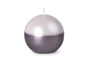 Vánoční svíčka ve tvaru koule je ozdobena stříbrnými reliéfy.