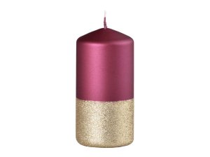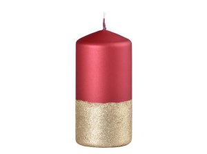 Vánoční svíčka ve tvaru válce napůl černá a napůl červená zdobená ve středu zlatými glitrovými proužky.