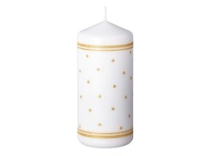 Svíčka ve tvaru válce má matný povrch a je zdobena třpytivými vločkami.