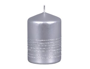 Svíčka ve tvaru válce. Má hladký, lesklý povrch zdobený jemnými třpytivými proužky.
