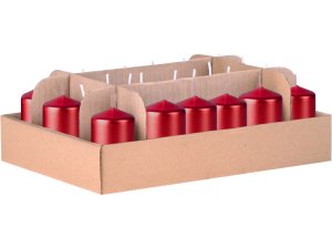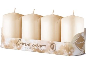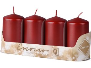 Sada adventních svíček. Mají tvar válce a povrch mají hladký, v úpravě metalický lesk.