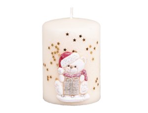 Vánoční svíčka ve tvaru válce je ozdobena medvídkem v zimním období.