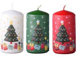 Svíčka ve tvaru válce. Ve spodní polovině je zdobená bílými hvězdami různých velikostí.